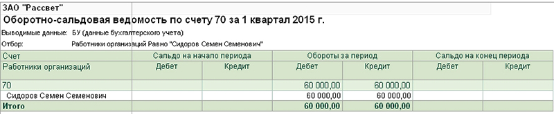Но прежде чем мы будем платить НДФЛ, проверим корректность наших предыдущих действий. Сформируем оборотно-сальдовую ведомость по счету 70 с отбором по сотруднику Сидорову (представлена на рис. 8). Судя по этой ведомости с Сидоровым мы рассчитались.